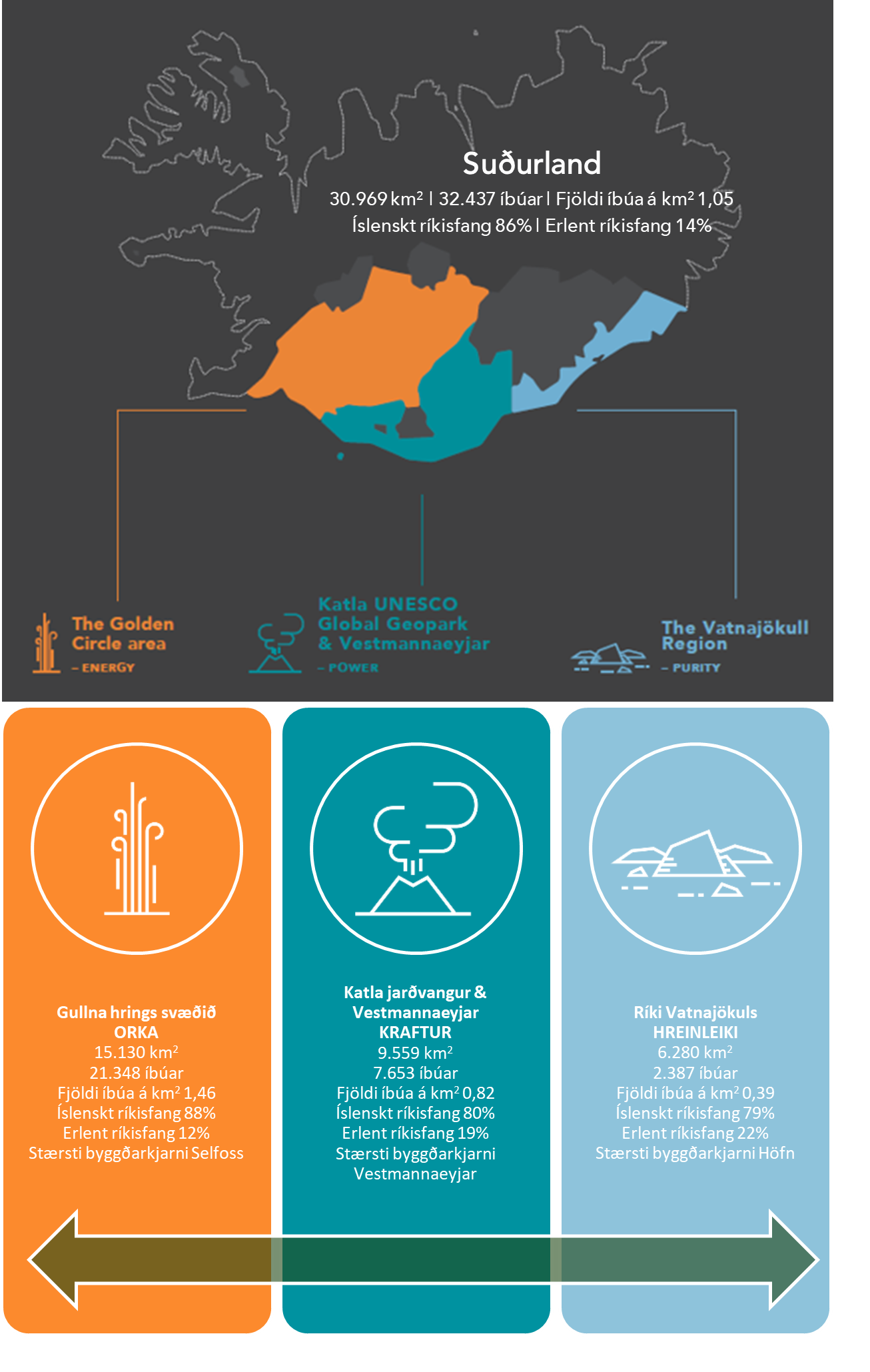 Þar sem ólíkar áskoranir og tækifæri eru til staðar innan þessa stóra landshluta hefur honum verið skipt niður í þrjú svæði. Markmiðið með því er að draga fram styrkleika hvers svæðis og fá gesti til að dvelja lengur þar sem Suðurland hefur upp á svo margt fjölbreytt að bjóða.