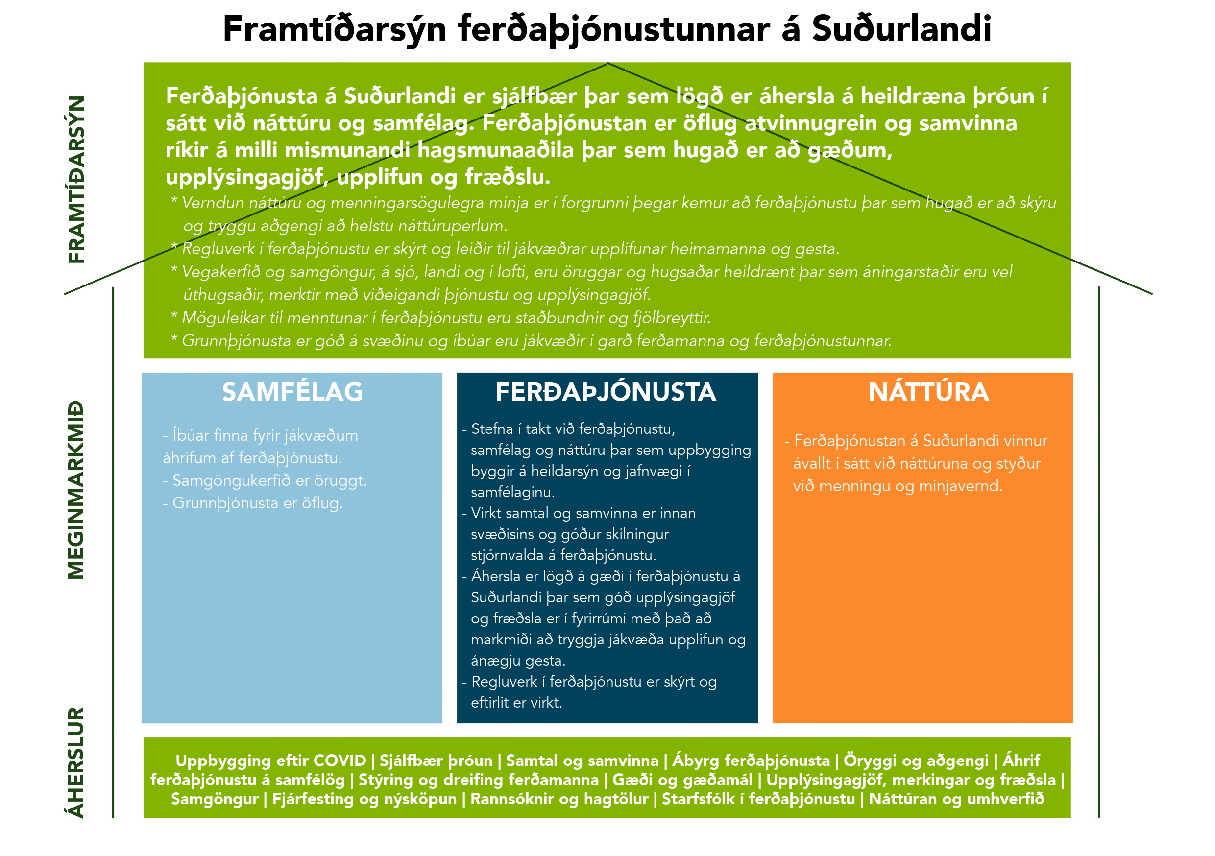 Sjálfbær þróun áfangastaðarins er lykilþáttur í framtíðarsýn ferðaþjónustunnar á Suðurlandi. Það er að mörgu að huga enda nær ferðaþjónustan til flutninga, gistingar, matar og náttúrustaða, viðburða og svo mætti lengi telja. Sjálfbær þróun ætti að vera leiðarstefið í allri stefnumótun og áætlanagerð, með virkri þátttöku ríkis, sveitarfélaga, atvinnugreinarinnar og íbúa landshlutans.