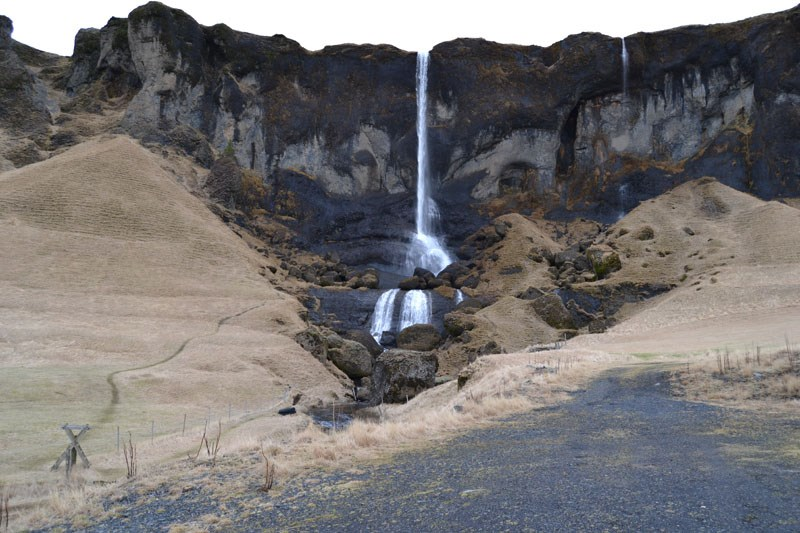 Is a waterfall in the Eyjafjöll mountain range. The waterfall is famous for the water in it sometimes not being able to reach the ground, as the water is blown away on the way down due to heavy wind. It is close to road nr. 1, and there is a small parking place near a large weather sign shortly after the turn-off to Seljalandsfoss.
