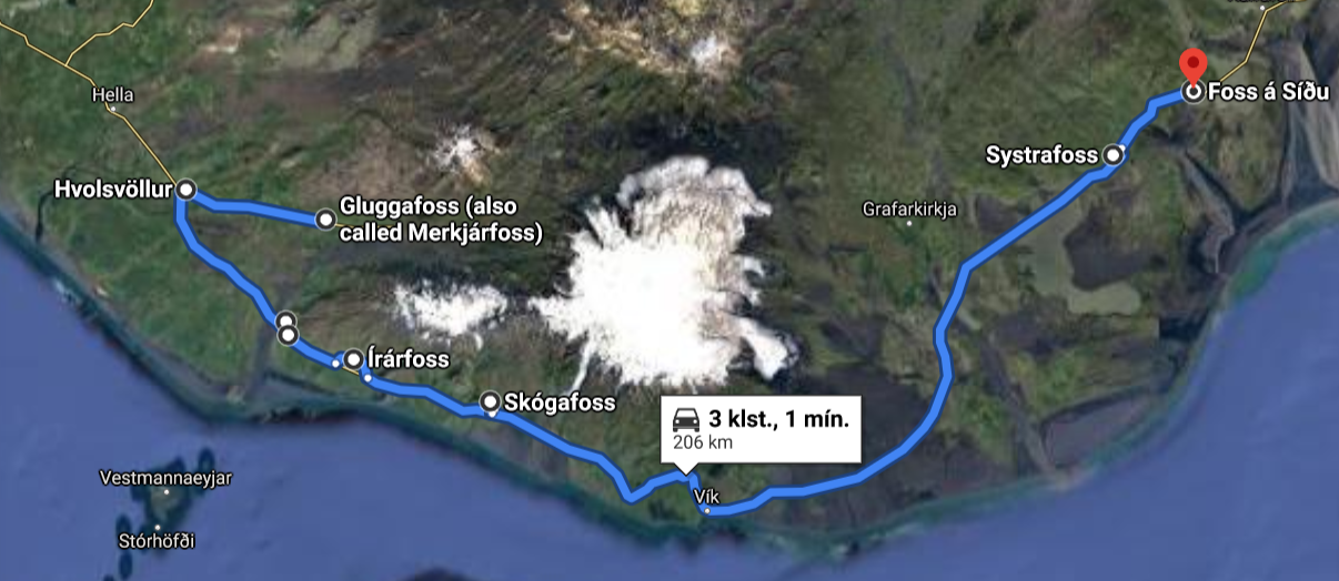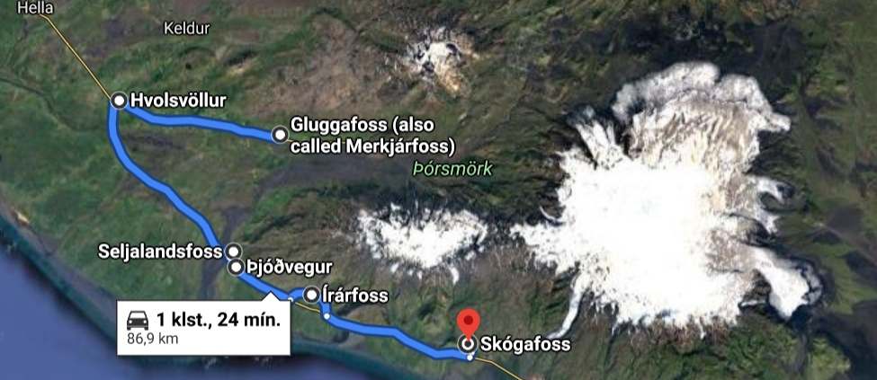 Many beautiful waterfalls are within Katla Geopark and most of them have it in common that they fall off an old sea-cliff line formed at the end of the last glaciation in Iceland when the relative sea level was much higher than it is today. The waterfalls listed here are all close to the ring road (road nr. 1) and are easily accessible for most people. There are also numerous other waterfalls within the Geopark, as are magnificent geosites and museums. The short route lies between the towns of Hvolsvöllur and Vík and the traveling time is about two hours. The longer route goes to the east of the town of Kirkjubæjarklaustur and the traveling time for that route is about four hours. The shorter route is a perfect day tour, while it would be a good idea to stay overnight somewhere if the longer route is taken. There are many hotels, hostels, cabins, and camping sites near the waterfall route, so finding a place to stay should not be difficult.