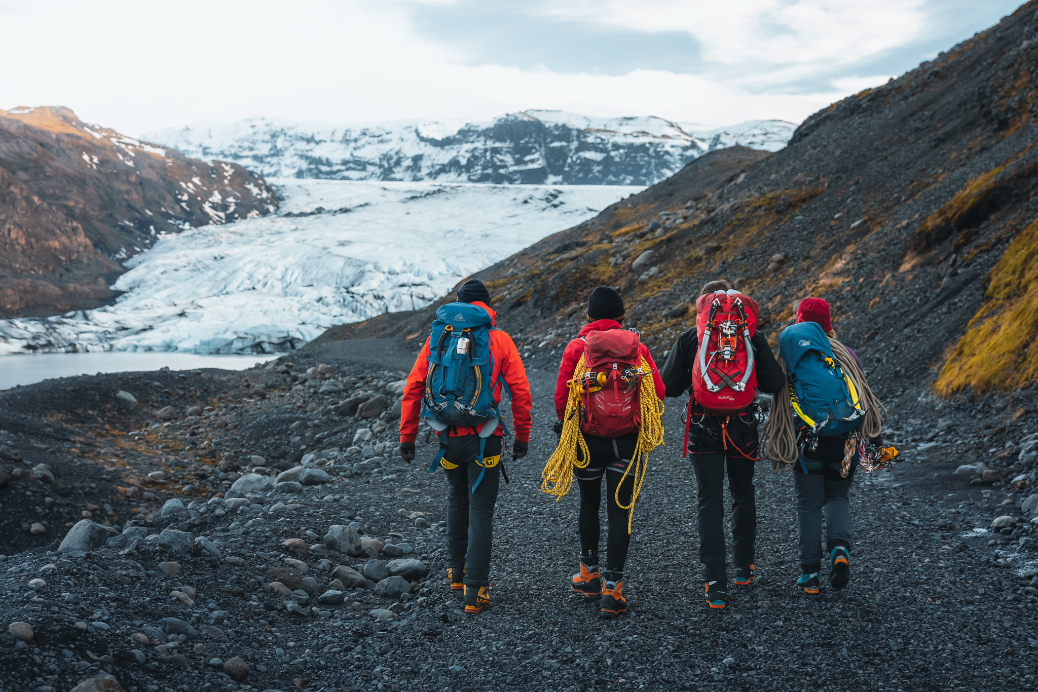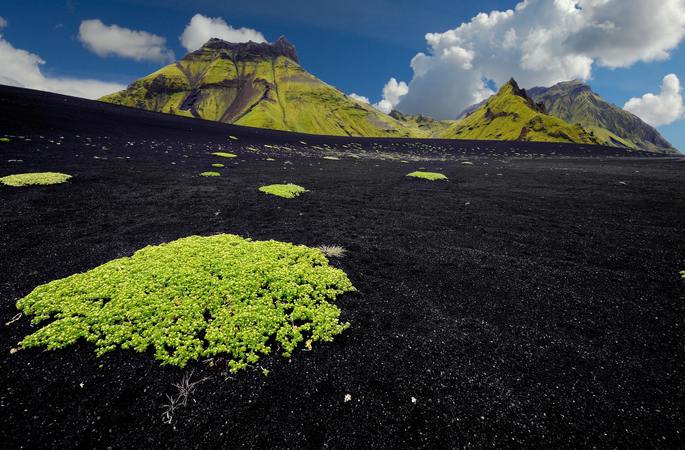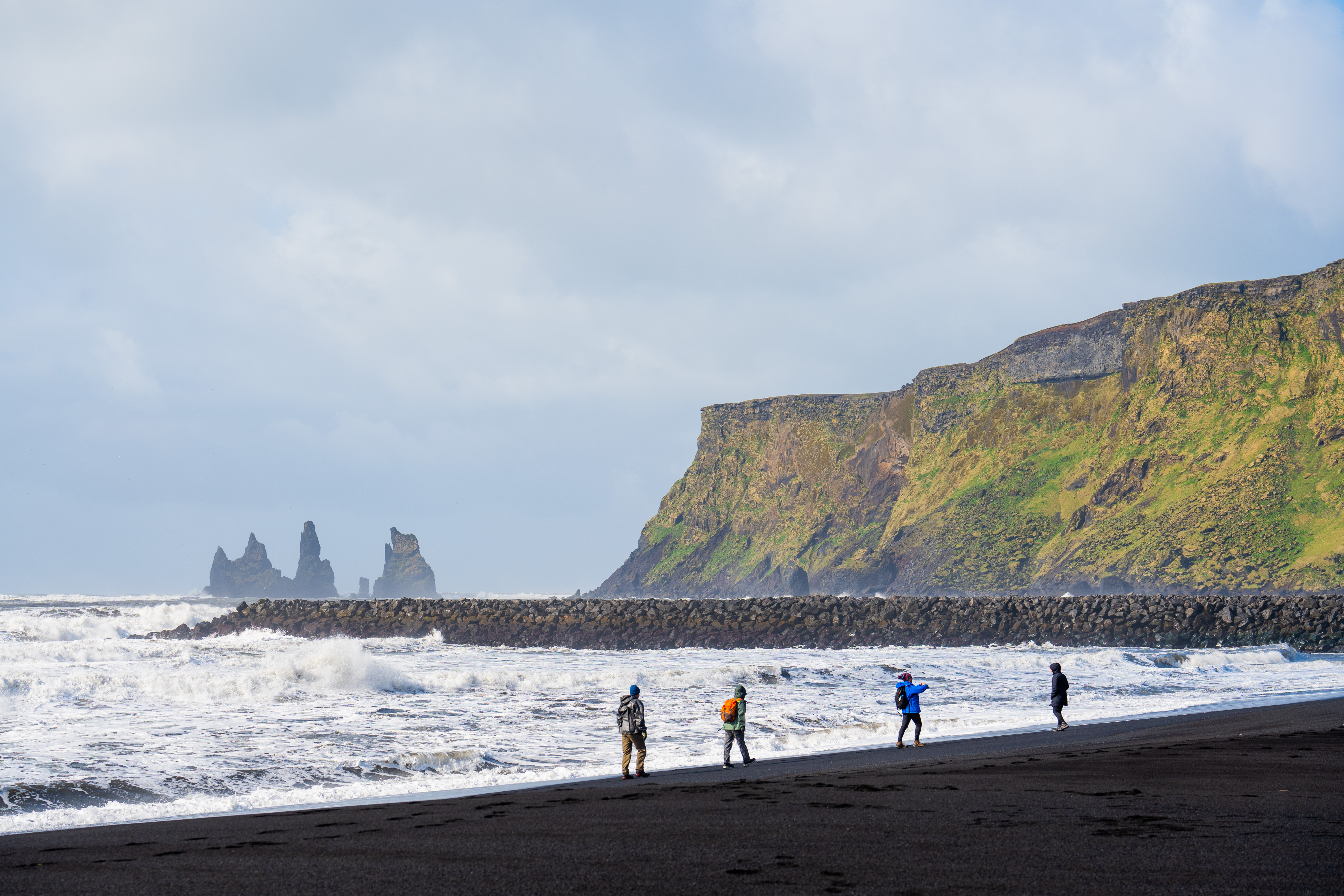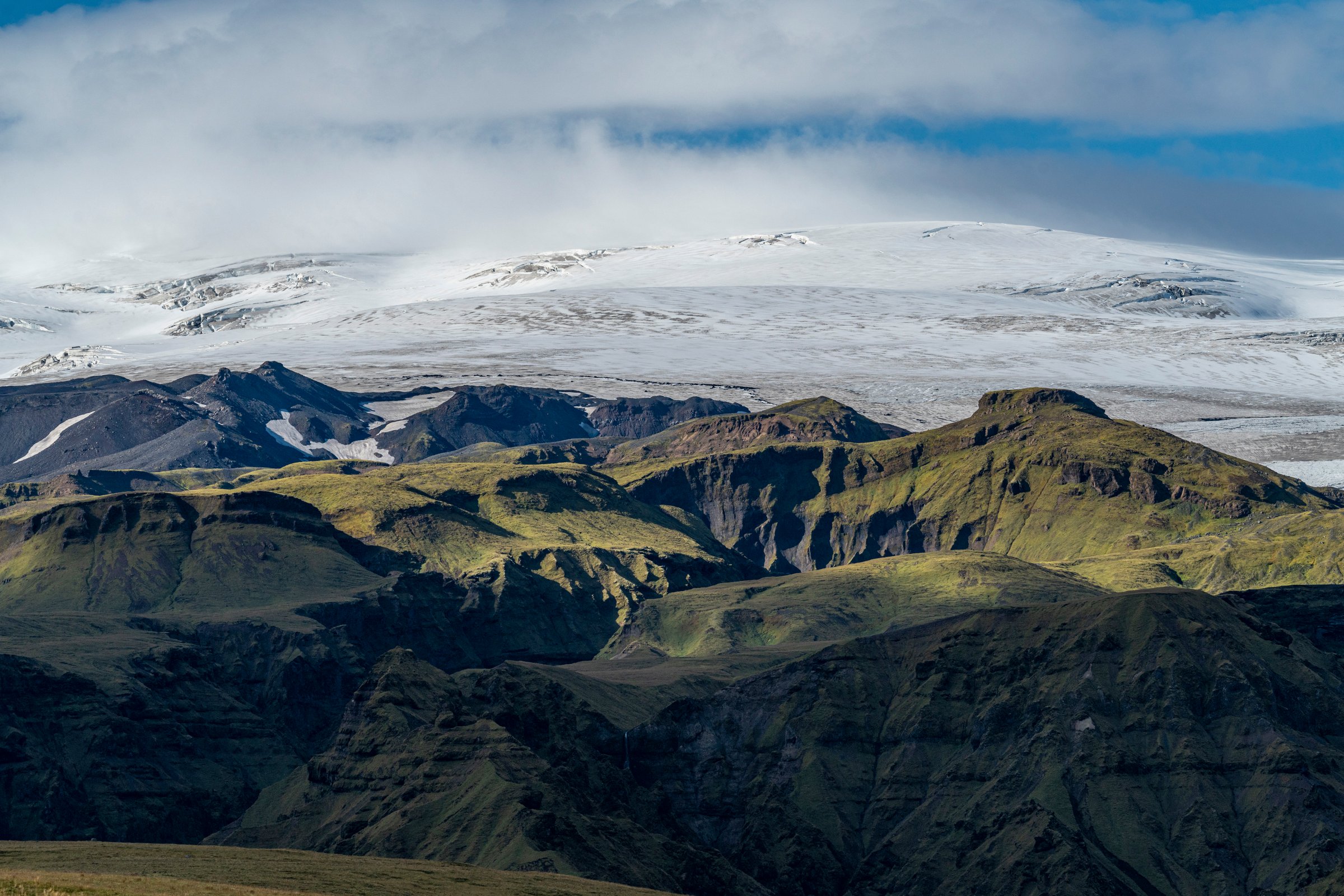 The vicinity of Katla is recognized by its vast black sands. While the volcano itself is hiding under thick layers of ice, its surrounding glacier, Mýrdalsjökull, is a majestic sight. Katla erupted at least twenty times from the year 930 until 1918, producing the characteristic ash, or black sand, people so long to see. A glacier activity on Sólheimajökull glacier, a visit to Reynisfjara beach, and the unique Icelandic Lava Show are unforgettable ways to enjoy this region. Despite being a popular region for tourists, the area also holds a great diversity of quiet spots and accessible hikes.