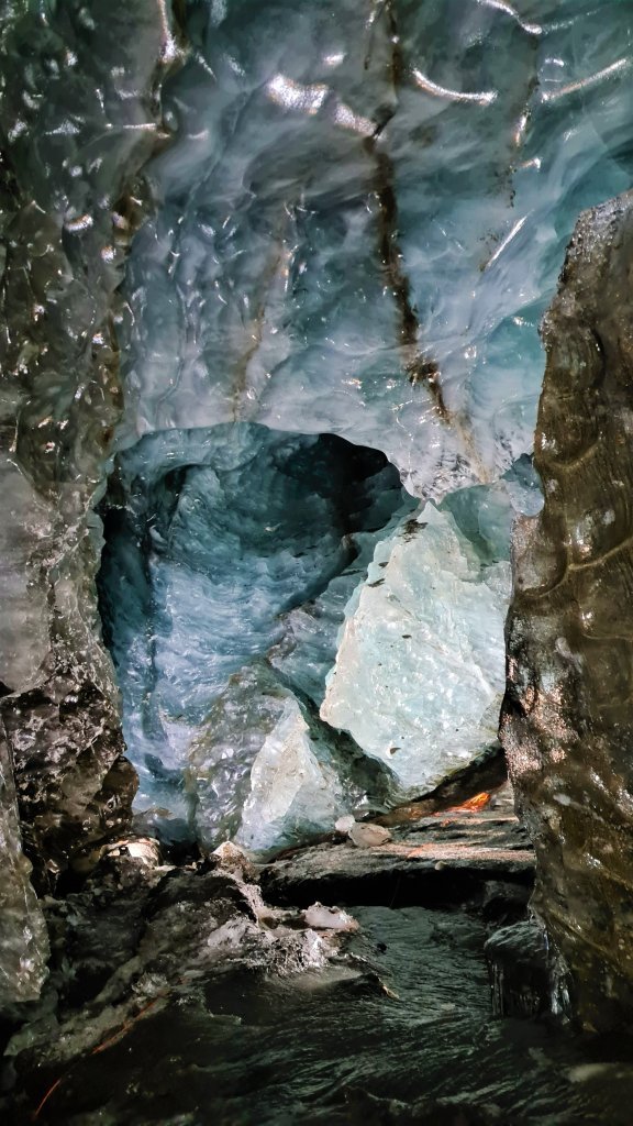 To get there you either need to take a ride in a glacier monster truck or snowmobile from the edge of the glacier to the amazing ice cave which just adds to the adventure.