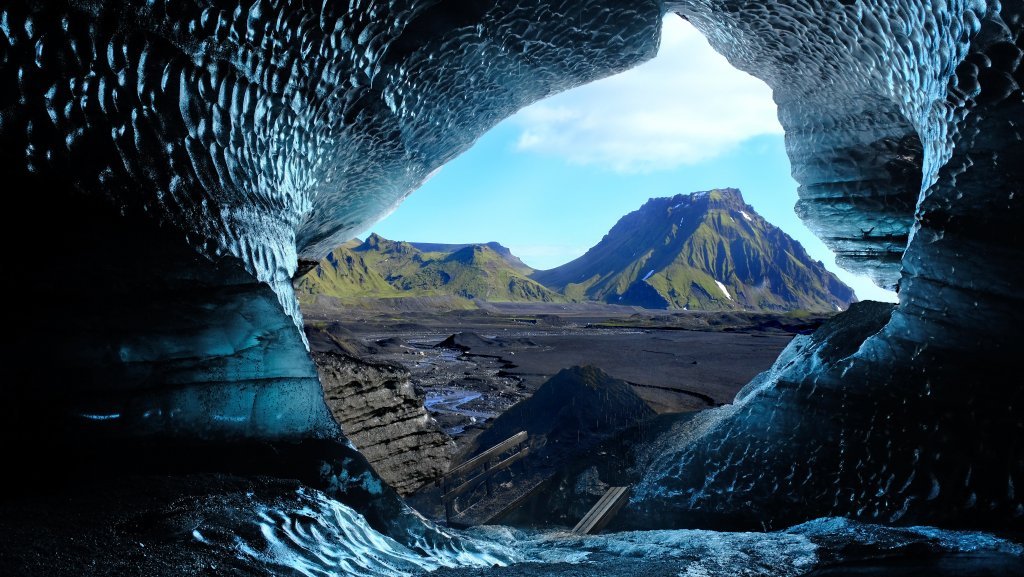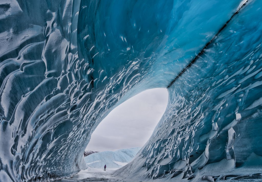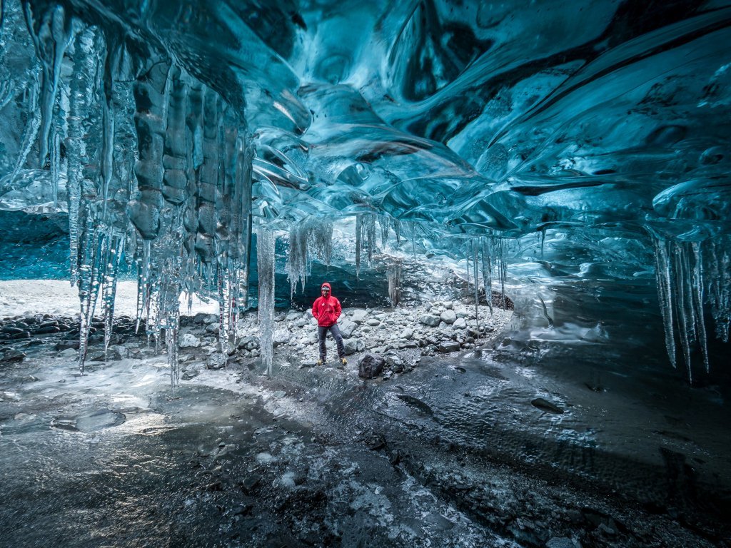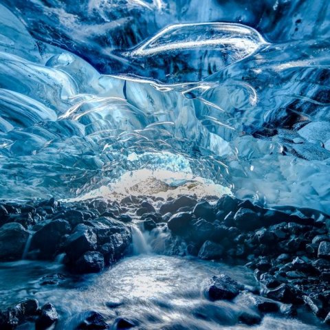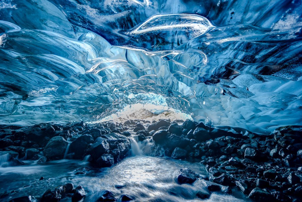 Most of the ice caves are formed as canals where the water runs through from the top of the glacier, trying to find its way out at the bottom of the glacier. The water digs its way from underneath the glacier and forms the caves. Usually, they are formed in the summer when the flow of meltwater is at its peak. At that point, the caves are full of water and not accessible. When the shedding stops during fall, the flow of water in the cave greatly reduces and usually stops completely throughout the winter. The temperature becomes cold enough to strengthen the ice. As a result, what you have left is an ice cave.