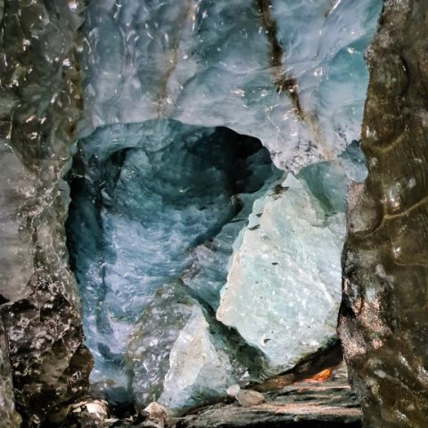 As evident by the name, these caves' ceilings are made with thick translucent blue colored glacial ice which lets a little bit of natural light pass through creating a wonderful view for the visitors. The blue color is a result of the compression of snow into ice. The weight of the ice presses out the oxygen.