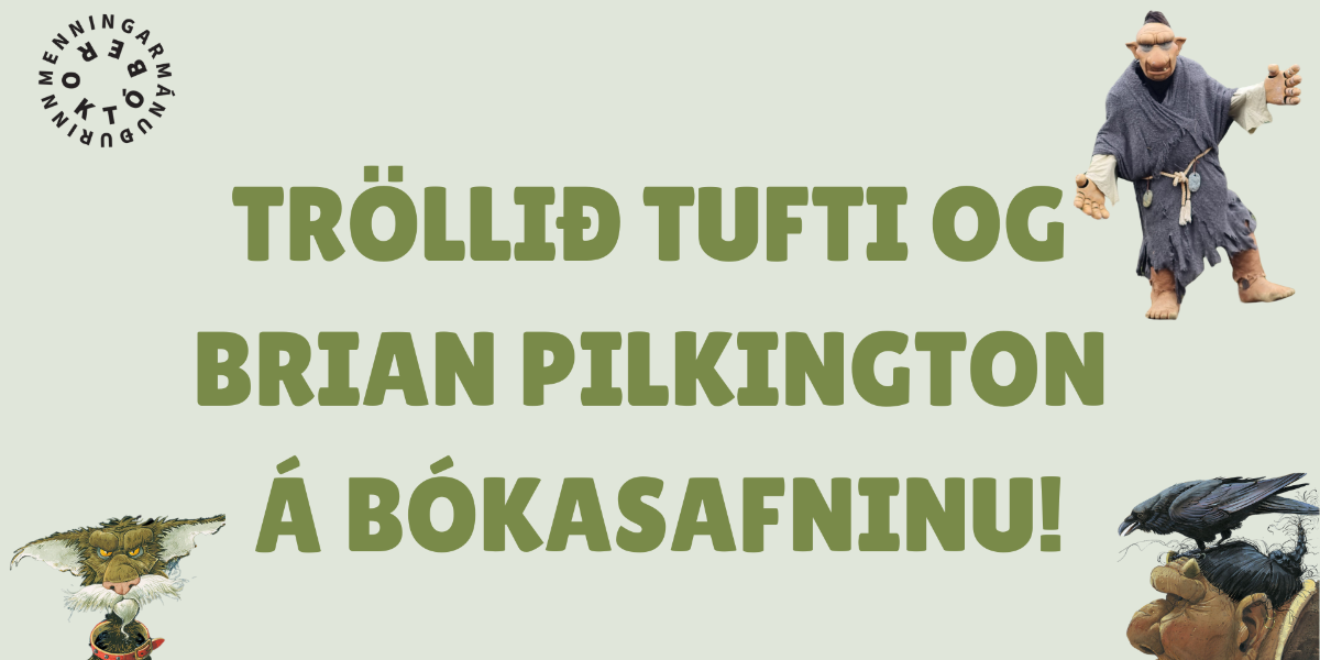 Það verður sannkölluð gleðistund á Bókasafninu laugardaginn 5. október þegar tröllið Tufti Túnfótur kemur í heimsókn ásamt besta vini sínum Brian Pilkington!