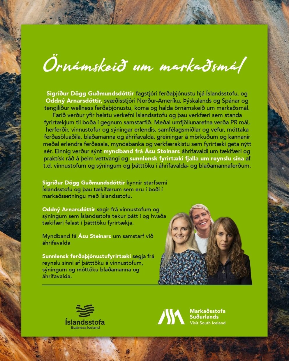 Sigríður Dögg Guðmundsdóttir fagstjóri ferðaþjónustu hjá Íslandsstofu, og Oddný Arnarsdóttir, svæðisstjóri Norður-Ameríku, Þýskalands og Spánar og tengiliður wellness ferðaþjónustu, koma og halda örnámskeið um markaðsmál. Farið verður yfir helstu verkefni Íslandsstofu og þau verkfæri sem standa fyrirtækjum til boða í gegnum samstarfið. Meðal umfjöllunarefna verða PR mál (almannatengsl), herferðir, vinnustofur og sýningar erlendis, samfélagsmiðlar og vefur, móttaka ferðasöluaðila, blaðamanna og áhrifavalda, greiningar á mörkuðum og kannanir meðal erlendra ferðasala, myndabanka og verkfærakistu (traveltrade) sem fyrirtæki geta nýtt sér. Einnig verður sýnt myndband frá Ásu Steinars áhrifavaldi um tækifæri og praktísk ráð á þeim vettvangi og stutt erindi verða frá sunnlenskum fyrirtækjum um reynslu sína af t.d. vinnustofum og sýningum og þátttöku í áhrifavalda- og blaðamannaferðum.