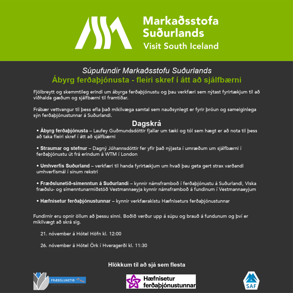 Fundirnir eru opnir öllum og vonumst við að sjá sem flesta. Boðið verður upp á súpu og brauð á fundunum og þvi er mikilvægt að skrá sig.