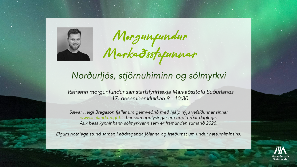 Norðurljósavirknin getur verið mikil ráðgáta og erum við svo heppin að fá Sævar Helga Bragason, betur þekktan sem Stjörnu-Sævar, sem næsta gest á morgunfund Markaðsstofunnar þann 17. desember klukkan 9-10:30.
