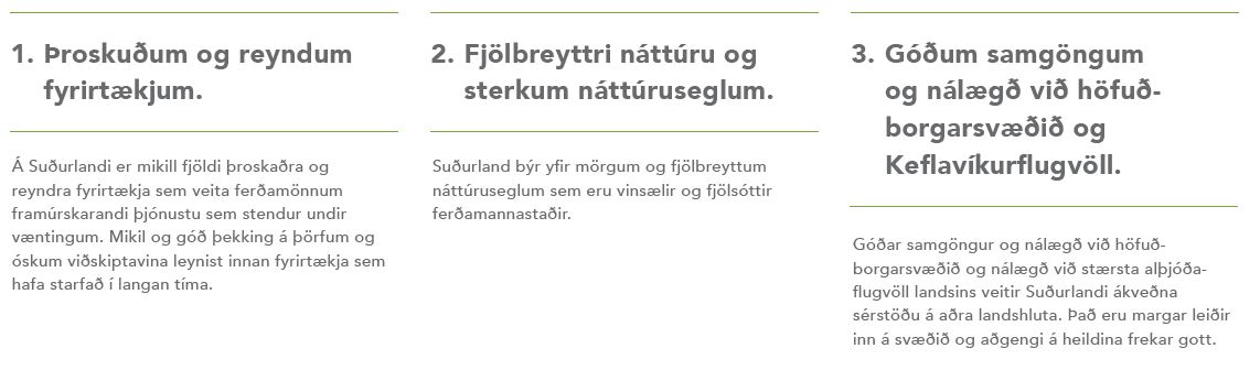 Markaðslega er Suðurlandi skipt upp í þrjú svæði þar sem einkunnarorð svæðanna eru orka, kraftur og hreinleiki. Með því að draga svæðin fram í markaðssetningunni (plana) eru dregnir fram styrkleikar og áherslur hvers svæðis fyrir sig með það að markmiði að fá gesti til að dvelja lengur á svæðinu þar sem landshlutinn hefur svo fjölmargt að bjóða og upplifa.